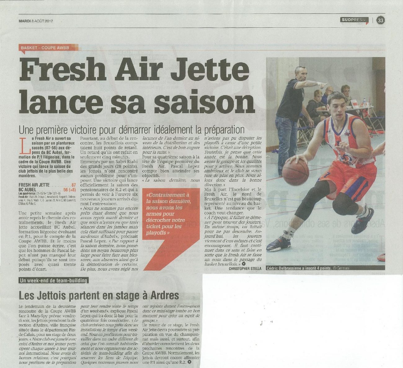 Le Fresh Air dans la presse … 10 août 2017 La victoire de dimanche en Coupe AWBB a manifestement intéressé le groupe SudPresse qui lui consacre une demi page dans son édition de mardi !